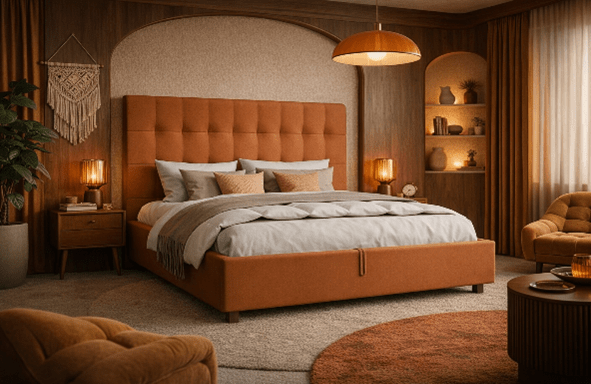 Powrót do estetyki retro, inspirowanej latami 70., wyraźnie zaznacza się w sypialni jako kontrapunkt dla miękkich, obłych form. Łóżka tapicerowane, obok cozy kształtów przyjmują bardziej wyraziste, często geometryczne bryły, wzbogacone o pikowania, przeszycia, guziki i dekoracyjne wykończenia. Równolegle, obok pastelowej palety, pojawiają się odcienie musztardowe i ceglane, typowe dla tej estetyki, które wprowadzają mocniejszy akcent i przełamują lekkość wnętrza